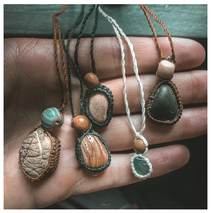 Que ce soit les pierres de l'île d'Anticosti, de la Gaspésie, ou des îles de la madeleine, il faut savoir que chacune des pierres a son histoire et son énergie. Certaines sont polies pendant 30 jours dans ma polisseuse, d'autres sont cueillis dans une énergie d'amour et d'émerveillement lors d'une aventure. La création de colliers est pour moi un espace où être est suffisant. La performance est endormie quand les nœuds construisent ce bijou. Faire naitre des colliers est une façon d'honorer mon moment présent et de rendre riche ma qualité de présence.