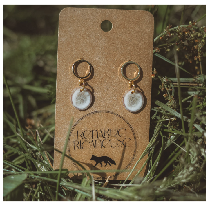 Les boucles d'oreilles Renarde ricaneuse sont conçus 100% au Québec. Plus précisément à Gaspé ou sur l'île d'Anticosti. J'utilise les bois des cerfs comme ornement. Je les façonne de mes propres mains, je les polit, les perce et utilise l'huile de lin comme finition naturelle.