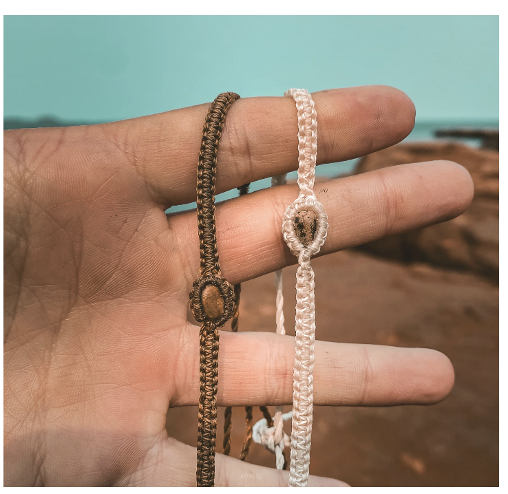 Les bracelets Renarde Ricaneuse deviennent, par leur micro-pierre, un doux rappel de respirer. Je cueille mes pierres dans ces endroits qui me font un grand bien. Je choisis les roches qui m'appellent et je leur tisse une place dans mon cœur. Ces bracelets sont tous déjà aimés par ce qu'ils sont. La Gaspésie dans le cœur, les Îles-de-la-Madeleine comme refuge intérieur et l'île d'Anticosti telle un aventure sauvage par en dedans comme par dehors.